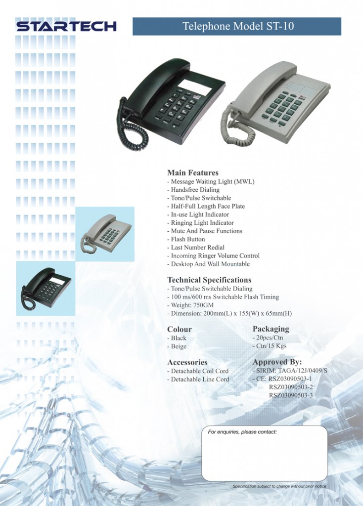 * Message Waiting Light (MWL) * Handsfree Dialing * Tone/Pulse Switchable * Half-Full Lenglh Face Plate *